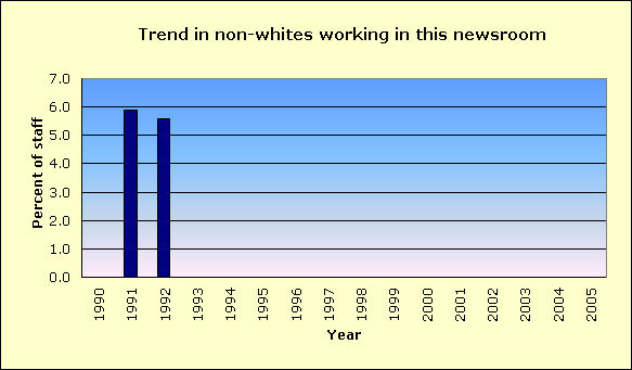 Year | Non-white % of newsroom staff | Non-white % of circulation area | Newsroom Diversity Index (parity=100) | |||||||