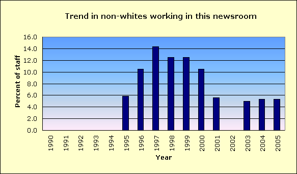 | 2. Source for staffing: Survey by American Society of Newspaper Editors, April 2005. Newspapers report non-white staff as of the end of the previous year. | ||||||||||