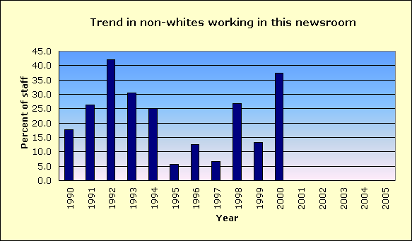 Year | Non-white % of newsroom staff | Non-white % of circulation area | Newsroom Diversity Index (parity=100) | |||||||