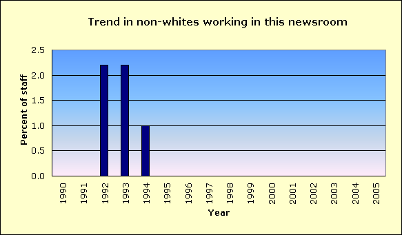 Year | Non-white % of newsroom staff | Non-white % of circulation area | Newsroom Diversity Index (parity=100) | |||||||
