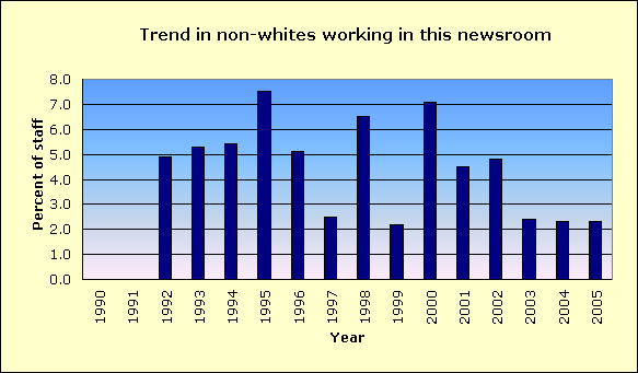 | Year | Non-white % of newsroom staff | Non-white % of circulation area | Newsroom Diversity Index (parity=100) | |||||||