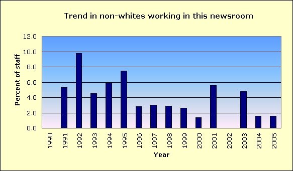 | 2. Source for staffing: Survey by American Society of Newspaper Editors, April 2005. Newspapers report non-white staff as of the end of the previous year. | ||||||||||